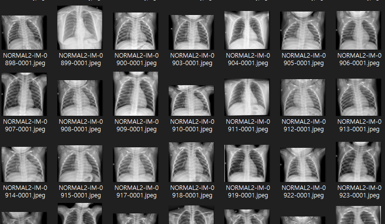 2020년 10월 6일 기준 본 데이터셋은 train, test, val폴더로 이루어져 있으며 각 폴더마다 NORMAL(정상)과 PNEUMONIA(폐렴)로 구분되어 있다.