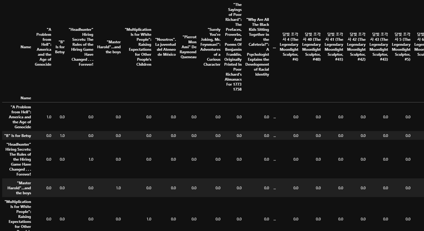 사이킷런의 코사인 유사도를 이용하여 도서들 사이의 유사도를 비교했다.