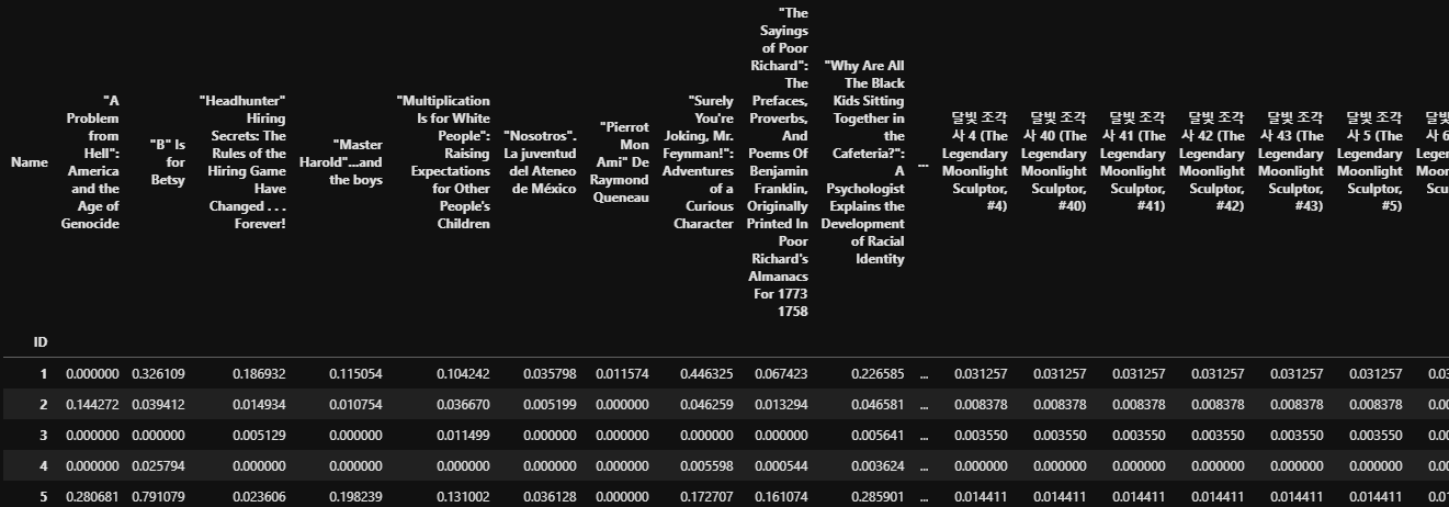 최근접 이웃 협업 필터링을 위해선 유저ID, 도서명, 평점으로 구성된 테이블을 [그림 2]와 같이 가로축은 유저, 세로축은 도서명, 데이터는 평점으로 구성된 테이블로 변환해야 한다.