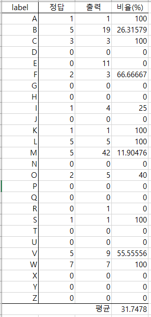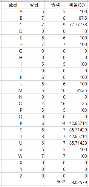 음... 성능이 오르긴 했고 출력이 없는(출력이 0인)것을 제외하면 꽤 높은 accuracy가 나왔다.