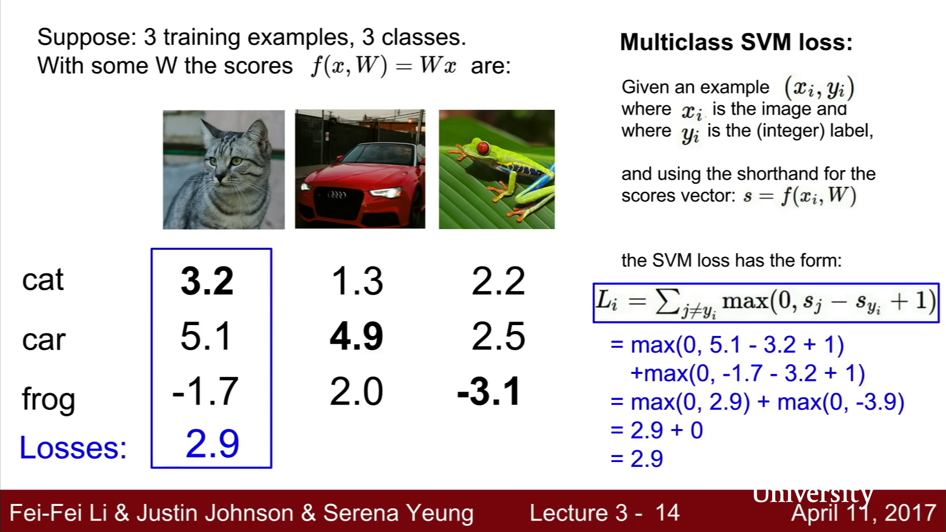 2) 여기서 정답 class인 cat을 제외한 나머지 class(car, frog)값으로 각각 $max(0, s_{j}- s_{y_{i}}+ 1)$를 계산한다.