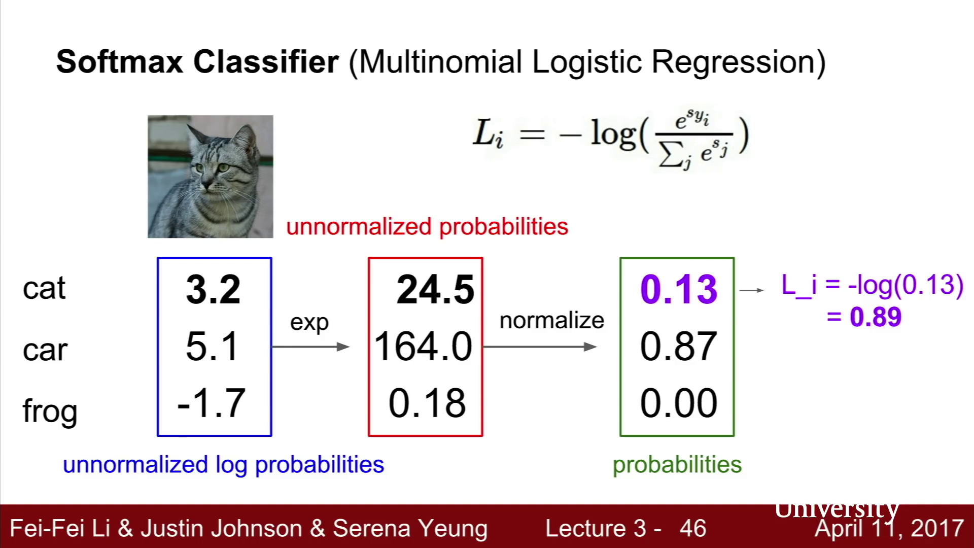 multiclass SVM loss에서 loss의 값은 상대적 비교시에만 의미가 있었고 score 자체에는 의미가 없었다. softmax classifier는 score 자체에 의미를 부여하고 수식을 이용해 확률분포를 계산한다.