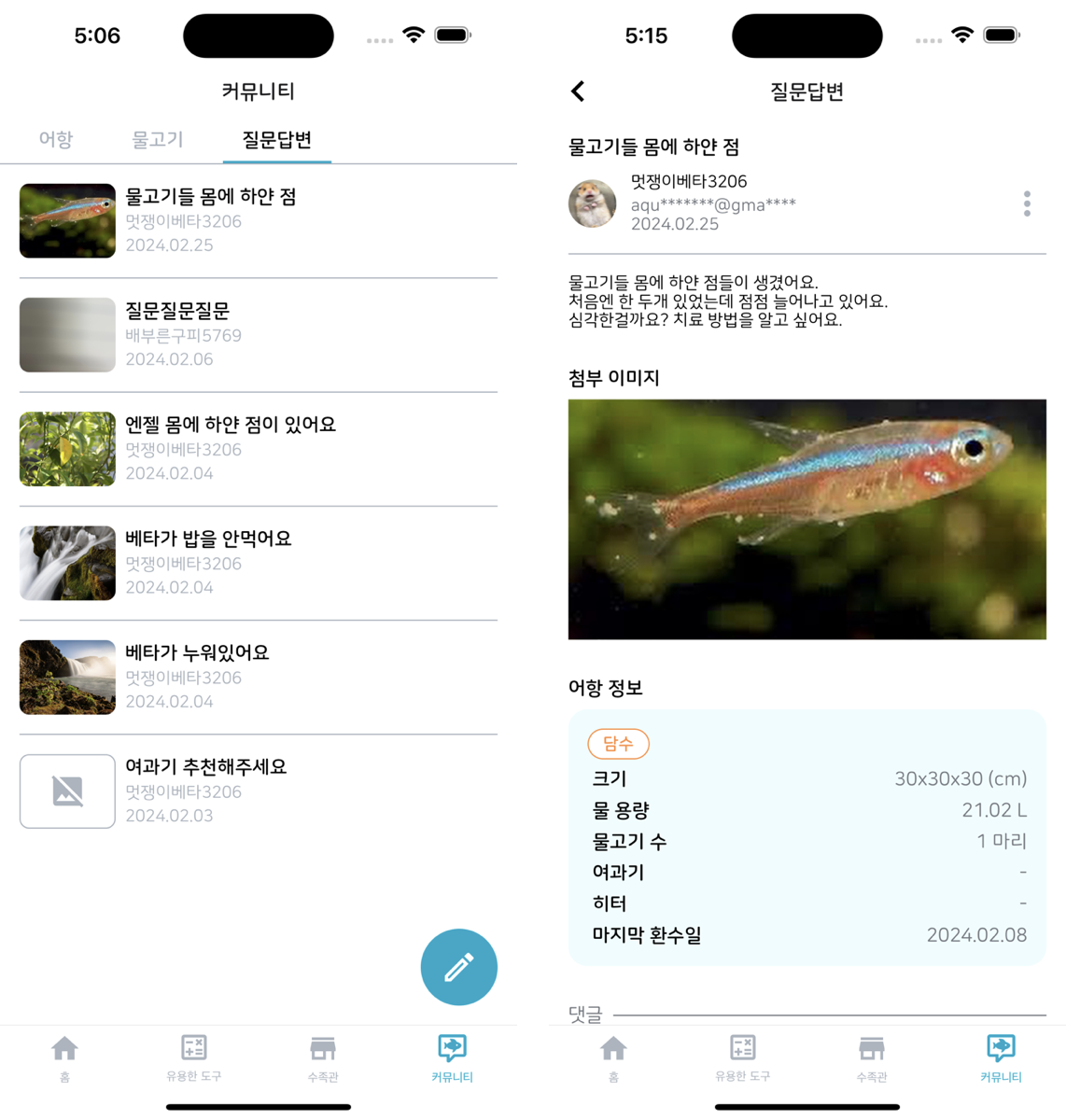 물생활을 하며 생기는 다양한 질문을 할 수 있고, 답변을 달 수 있는 "질문답변"항목을 추가했다.