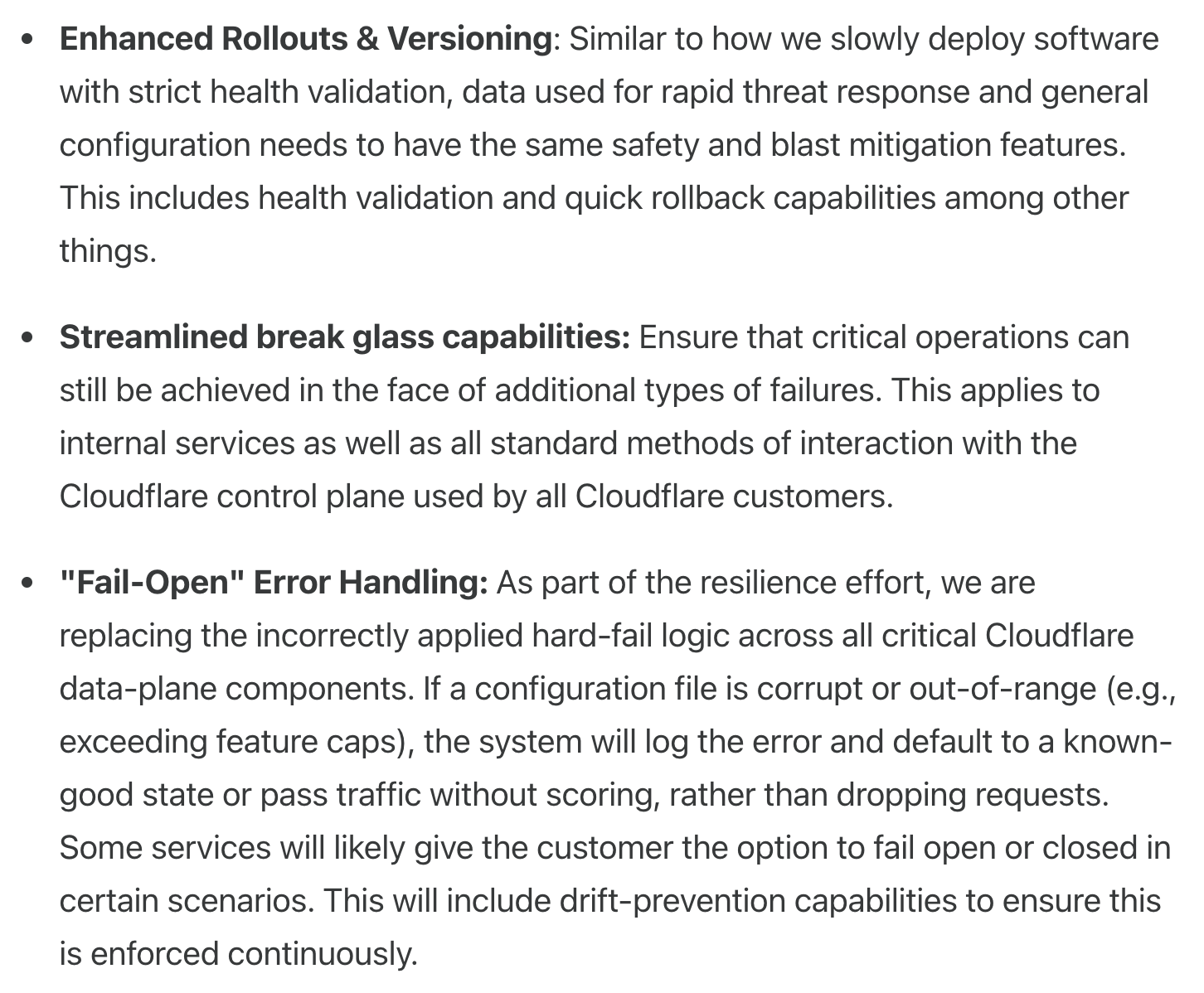 2025년 11월 18일에 발생했던 Cloudflare 중단 사고도 이처럼 관련 없는 변경을 수행하다가 전체 네트워크에 문제가 발생한 사건이었다. 이런 문제를 해결하기 위한 변경 내용이 공유되었으나 아직 이 항목은 배포하지 못한 상태이다.